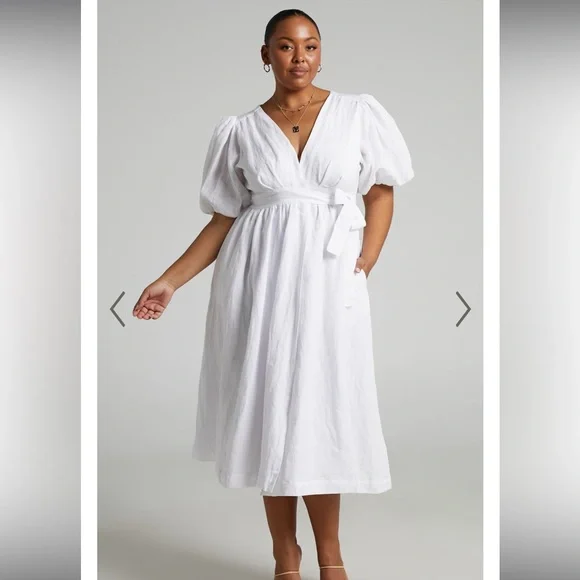 Showpo Dresses Amalie The Label Size Us 2 Franc Linen Puff Sleeve Wrap Midi Dress In White Poshmark
